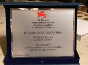 Venezia, 3 settembre 2025 – Alla dodicesima edizione del “Premio Cinema & Industria”, nell’ambito dell’82ª Mostra Internazionale d’Arte Cinematografica di Venezia, è stato consegnato un riconoscimento al sindaco Igor Gabrovec per il lavoro svolto a favore della valorizzazione del Comune di Duino Aurisina, sempre più apprezzato come location d’autore.