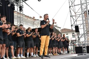 Sul palco di piazza Libertà, il Presidente Andrea Cainero e il Director Riccardo Robuschi hanno chiamato sul palco tutte le sette squadre del Mini Rugby e delle Giovanili, a partire dai più piccoli, gli under 6, fino agli under 18, per un totale di oltre 160 giovani rugbisti e rugbiste che sono stati poi raggiunti dai 35 giocatori della Prima squadra per il Campionato Nazionale 2025-2026.